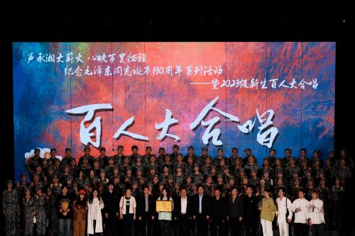 “韶峰高,湘水长”,伴随着悠扬的校歌,2023级新生百人大合唱拉开帷幕。“湘潭大学的合唱比赛有着光荣的传统,从上世纪八十年代,湘潭大学一直将新生百人大合唱传承至现在,我们歌唱我们的党,歌唱我们的祖国,歌唱我们的人民,歌唱我们的领袖”,刘建平副校长如是说。